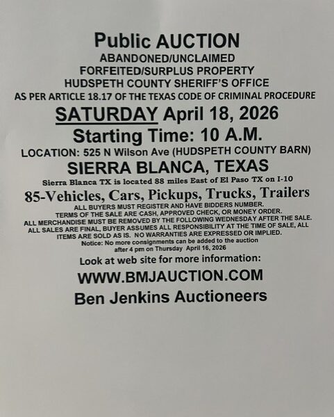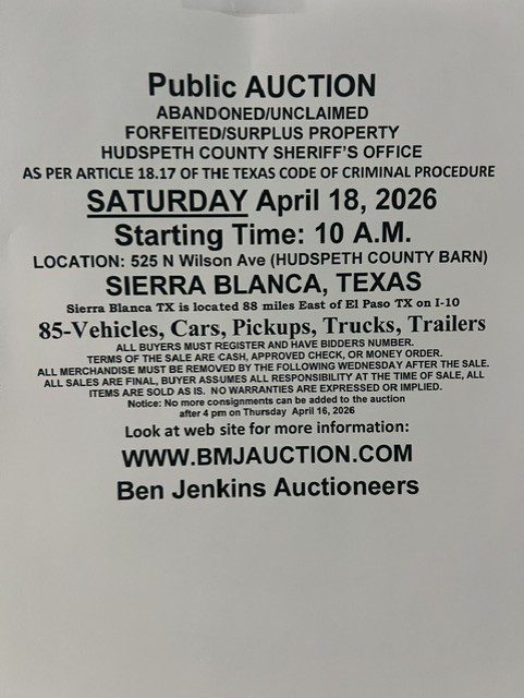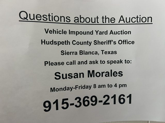 Contact for more information about the auction: 915-369-2161 ask for Susan Morales NO Internet Bidding Live Auction ONLY!!
